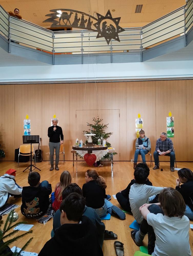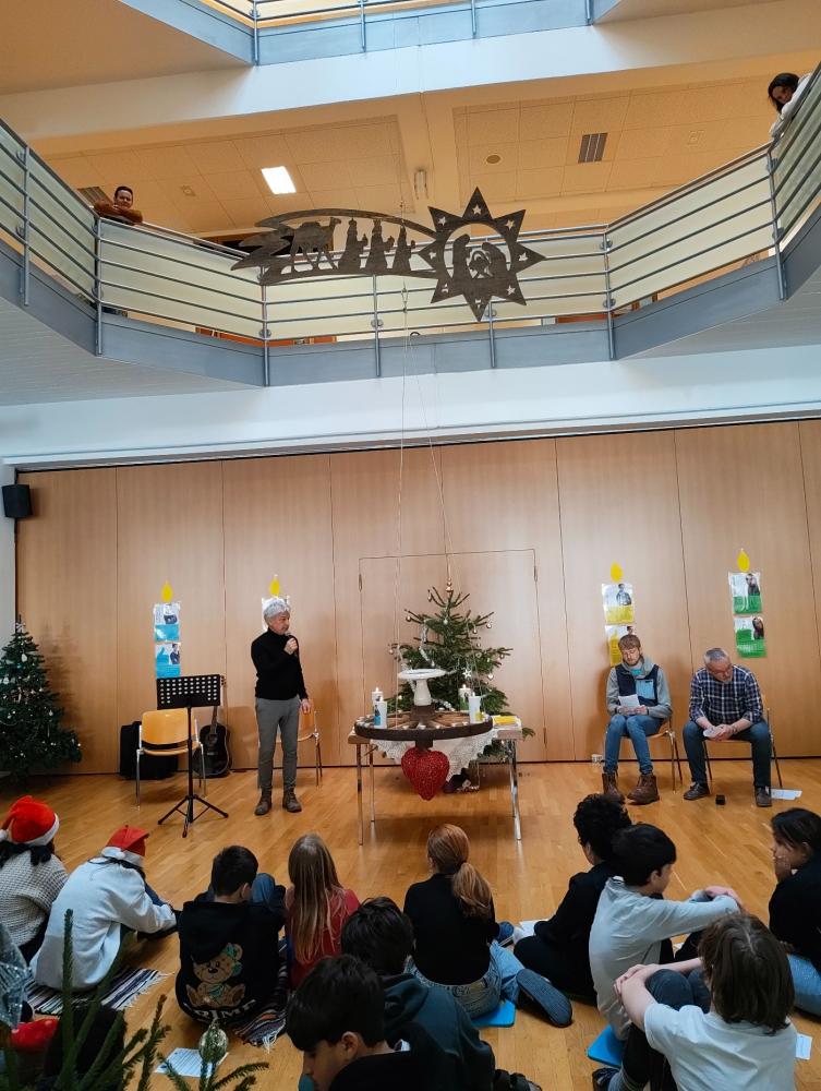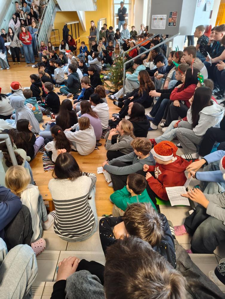 Besonders schön war der gemeinsame Weihnachtsgruß: „Frohe Weihnachten“ wurde in allen Sprachen, die es an unserer Schule gibt, ausgesprochen. Musik und unterschiedliche Beiträge machten die letzte Stunde vor den Ferien zu einem schönen Erlebnis.